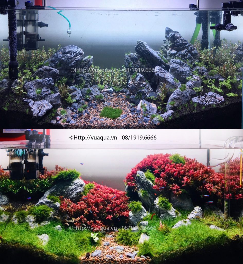 Hình ảnh bố cục đá khi mới setup và sau khi cây phát triển