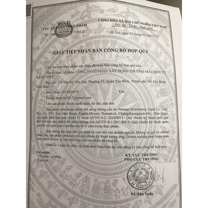 * Sản phẩm được chứng nhận của Bộ Y Tế & Cục An Toàn Thực Phẩm (ảnh đính kèm do chúng tôi Tự Chụp ở trên)