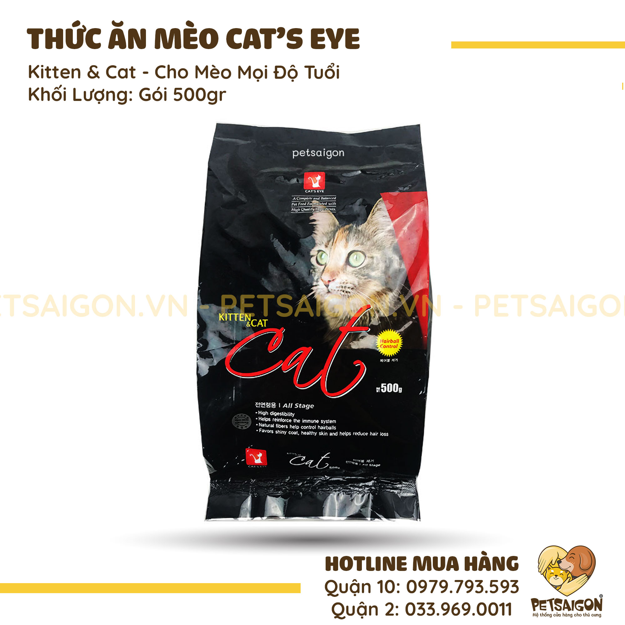 Thức ăn mèo Cat’s Eye là thức ăn nhập khẩu từ Hàn Quốc, cung cấp đầy đủ dưỡng chất và khoáng chất cần thiết cho mèo phát triển. Cat eye là thức ăn hạt khô dành cho mèo, chứa nhiều chất xơ tự nhiên giúp hạn chế hình thành búi lông trong hệ tiêu hoá của mèo và thúc đẩy hệ tiêu hoá khoẻ mạnh. Giúp kiểm soát chứng rụng lông, ngăn ngừa phản ứng dị ứng, hổ trợ tốt hệ thống miễn dịch. Taurine và vitamin A duy trì đôi mắt khoẻ mạnh và cải thiện thị lực cho da khoẻ mạnh và lông bóng mượt. Với công thức phối trộn đặc biệt làm giảm thiểu rụng lông, cải thiện bộ lông mèo và cải thiện tiêu hóa. Cat’s Eye cực kỳ dễ ăn bởi những thành phần thơm ngon, bạn không cần phải lo lắng là chú mèo nhà mình sẽ kén ăn, bỏ ăn trước loại thực phẩm khô này.